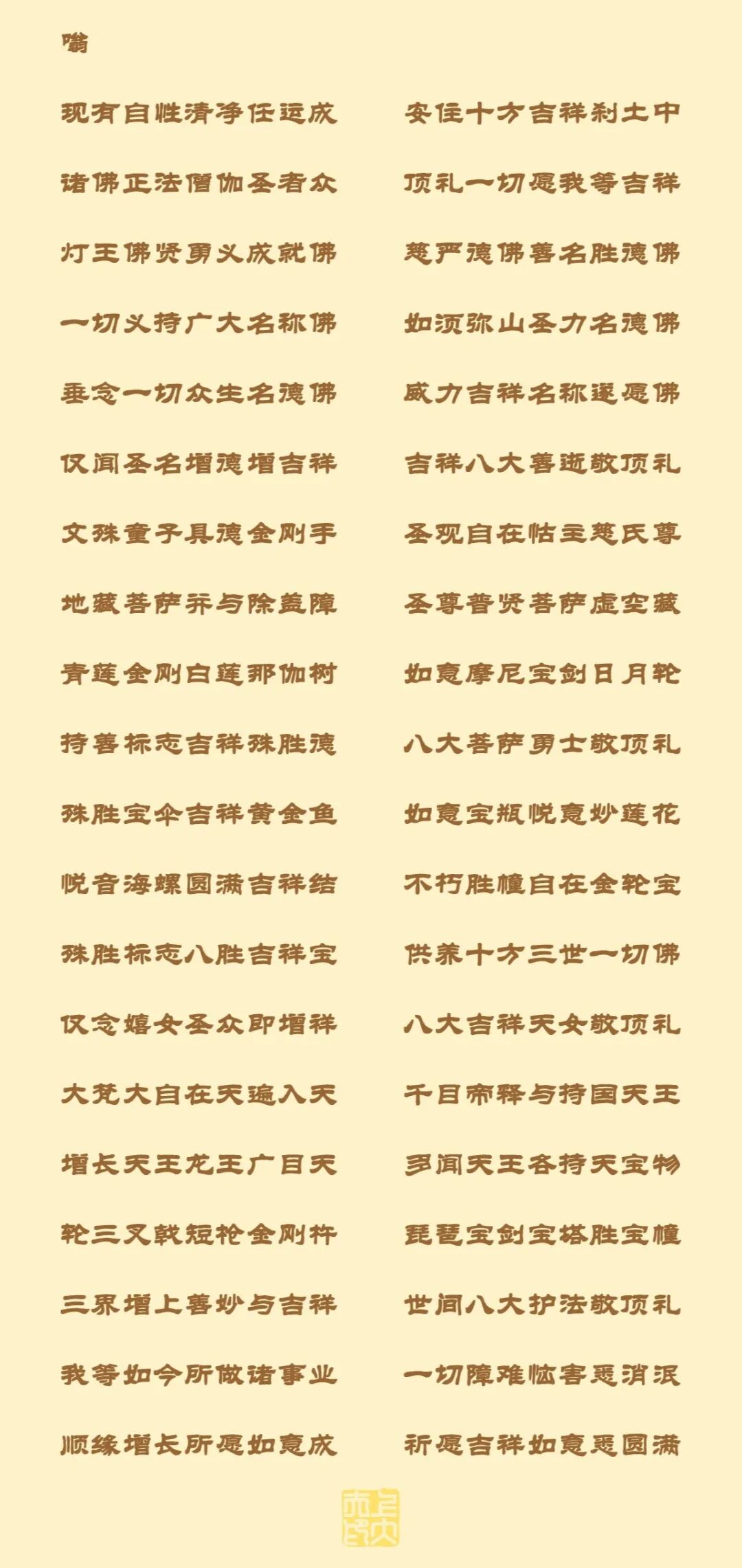 上大夫朝暮课 【礼佛三拜】 南无本师释迦摩尼佛(三遍) wēng móu ní móu ní 嗡 摩 尼 摩 尼 mā hā móu ní yē suō hā 玛 哈 摩 那 耶 娑 哈 (本师心咒三遍) 南无东方净琉璃世界消灾延寿药师佛 (三遍) die ya ta 喋 雅 他 ong 嗡 bei kan ze bei kan ze 贝 堪 则 贝 堪 则 ma ha bei kan ze 玛 哈 贝 堪 则 la za sa mu ga die so ha 拉 杂 萨 目 嘎 喋 梭 哈 (药师佛心咒三遍) 南无西方接引导师阿弥陀佛(三遍) 南无大慈大悲观世音菩萨(三遍) 【祈请文】 祈请南无大慈大悲观世音菩萨,神力召请:我们累生累世的父母双亲、堕胎婴灵、冤亲债主、冤情债主、冤缘债主,及体内外的一切有缘众生菩萨,和我们一起来念经、念佛、念咒,求生西方、速成佛道。(三遍) (停留1分钟,召请各自想祈请的众生菩萨一起念佛) 【变亿咒】 唵 三拔惹 三拔惹 波玛纳萨惹 嘛哈藏巴巴吽 帕得莎哈 【八圣吉祥颂】 (唱诵) 愿昼吉祥夜吉祥 三宝加被恒吉祥 护法天龙除灾障 一切圆满大吉祥 心灭罪亡两俱空,是则名为真忏悔。 四臂观音修诵仪轨 (三遍) 【融入本尊】 (至少108遍) (禅修,静坐10分钟) 【心经】 观自在菩萨,行深般若波罗蜜多时,照见五蕴皆空,度一切苦厄。舍利子,色不异空,空不异色,色即是空,空即是色,受想行识,亦复如是。舍利子,是诸法空相,不生不灭,不垢不净,不增不减。是故空中无色,无受想行识,无眼耳鼻舌身意,无色声香味触法,无眼界,乃至无意识界。无无明,亦无无明尽,乃至无老死,亦无老死尽。无苦集灭道,无智亦无得。以无所得故,菩提萨埵,依般若波罗蜜多故,心无挂碍,无挂碍故,无有恐怖,远离颠倒梦想,究竟涅磐。三世诸佛,依般若波罗蜜多故,得阿耨多罗三藐三菩提。故知般若波罗蜜多,是大神咒,是大明咒,是无上咒,是无等等咒,能除一切苦,真实不虚。故说般若波罗蜜多咒,即说咒曰:揭谛揭谛波罗揭谛波罗僧揭谛菩提萨婆诃。 【补阙真言】 nā mó hē là dá nà,duō là yè yē。 南 谟 喝 啰怛那,哆啰夜耶。 qiè là qiè là。 jù zhù jù zhù。 佉 啰 佉 啰。俱 住 俱 住。 mó là mó là。 hǔ là,hōng。 摩 啰 摩 啰。虎 啰,吽。 hè hè, sū dá ná, hōng。 贺 贺,苏 怛 拏,吽。 pō mò ná, suō pó hē。 泼 抹 拏,娑 婆 诃。 【补阙圆满真言】 ōng,hū lú hū lú,shè yì mù qiè,suō hē。 唵,呼 嚧 呼 嚧,社 曳 穆 契,娑 诃。 愿以此功德 庄严佛净土 上报四重恩 下济三途苦 若有见闻者 悉发菩提心 尽此一报身 同生极乐国 愿消三障诸烦恼 愿得智慧真明了 普愿罪障昔消除 事事常行菩萨道 愿生西方净土中 九品莲花为父母 花开见佛悟无生 不退菩萨为伴侣 特殊专属回向: 愿以此功德回向给我体内外的一切有缘随缘众生菩萨;回向给我今生累世的父母双亲、六亲眷属、历代宗亲、列祖列宗,以及我等有意无意伤害的一切众生菩萨; 愿以此功德回向给我今生累世看到的以及看到我的一切众生菩萨; 愿以此功德回向给我今生累世想到的以及想到我的一切众生菩萨; 愿以此功德回向给我今生累世伤害的以及伤害过我的一切众生菩萨; 愿以此功德回向给我今生累世帮助的以及帮助过我的一切众生菩萨; 愿以此功德回向给我今生累世障碍过的以及障碍过我的一切众生菩萨; 愿以此功德回向给本次法会的一切天龙护法、众仙菩萨、众神菩萨,所有来此坛场的所有众生菩萨; 愿你们破迷开悟,明心见性,福慧圆满,早证菩提,南无阿弥陀佛! 愿以此功德,回向世界和平,国泰民安,正法久住,法轮常转! 南无阿弥陀佛(三声) (备注:如若还有特别回向的,可自行补充回向内容)
