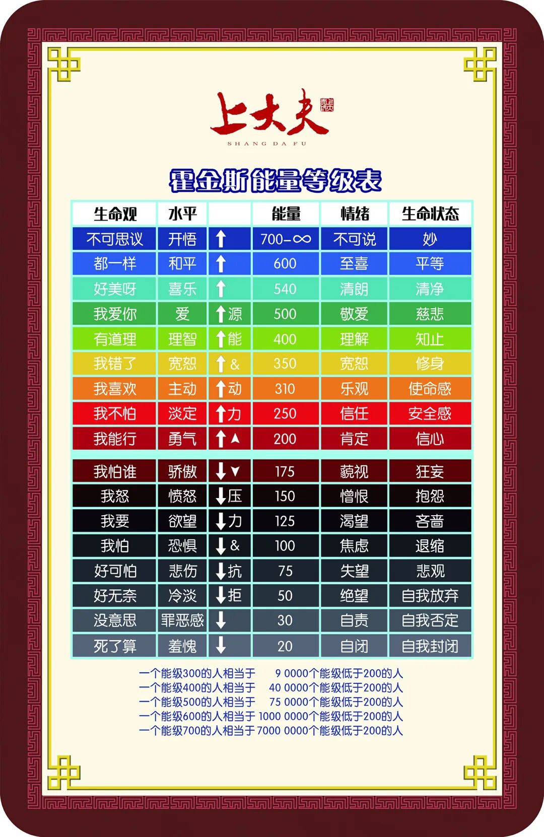 4. 200能量值是分水岭,凡事推诿、解释、辩解、不承认错误能量就在200以下,公开场所敢于承认错误是200以上能量。